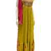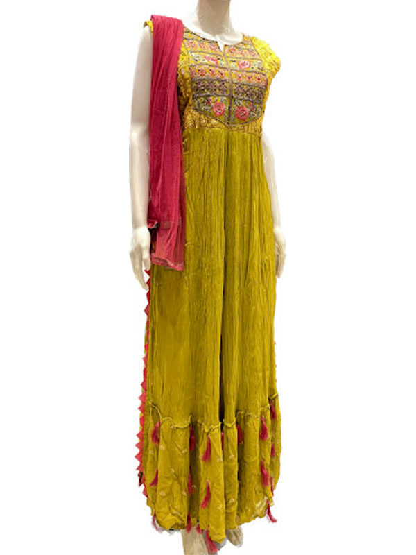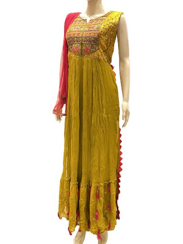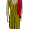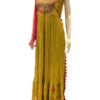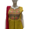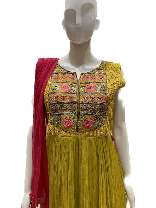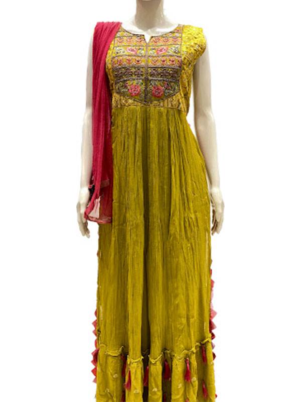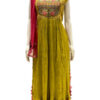 This ethnic wear set for ladies comprises a mehendi green traditional gown and bright red dupatta from Bonny’s. The soft texture, eye-catching color contrasting and fabulous naira cut attribute to the chic appeal of this women’s apparel. Wear this lovely gown and dupatta to make onlookers mesmerized with your stunning getup that speaks urban ethnicity!